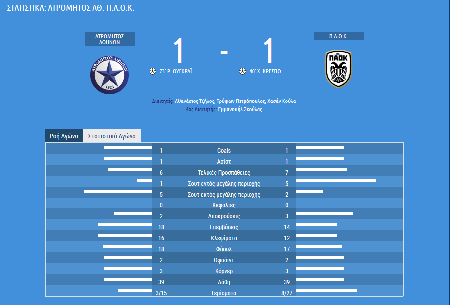 Δύο καλές στιγμές για τον ΠΑΟΚ και μία για τον Ατρόμητο δεν έγιναν γκολ και το ΜΑΤΣ έμεινε στην ισοπαλία. Ο Ατρόμητος δεν έμεινε ευχαριστημένος γιατί ήθελαν και πίστευαν οι παίκτες στην νίκη,Και ο ΠΑΟΚ να βγάζει παράπονα Όχι τόσο για την απόδοση του αλλά για την διαιτησία