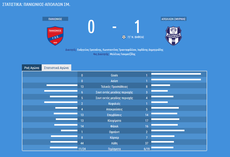 Στο αγώνα φάνηκε από την αρχή ότι ο Απόλλων πάταγε καλύτερα στο γήπεδο ήταν πιο φρέσκος καί με καλό Ρυθμό θα έβαζε δύσκολα στον Πανιώνιο που είχε καί την κούραση από τον αγώνα κυπέλλου με τον ΠΑΟΚ πριν 3 μέρες. Μεγάλος πρωταγωνιστής ο Βαφέας πού στο 22′ λεπτό σώζει την ομάδα τού Απόλλωνα πρωτού η μπάλα περάσει την γραμμή τού τέρματος.